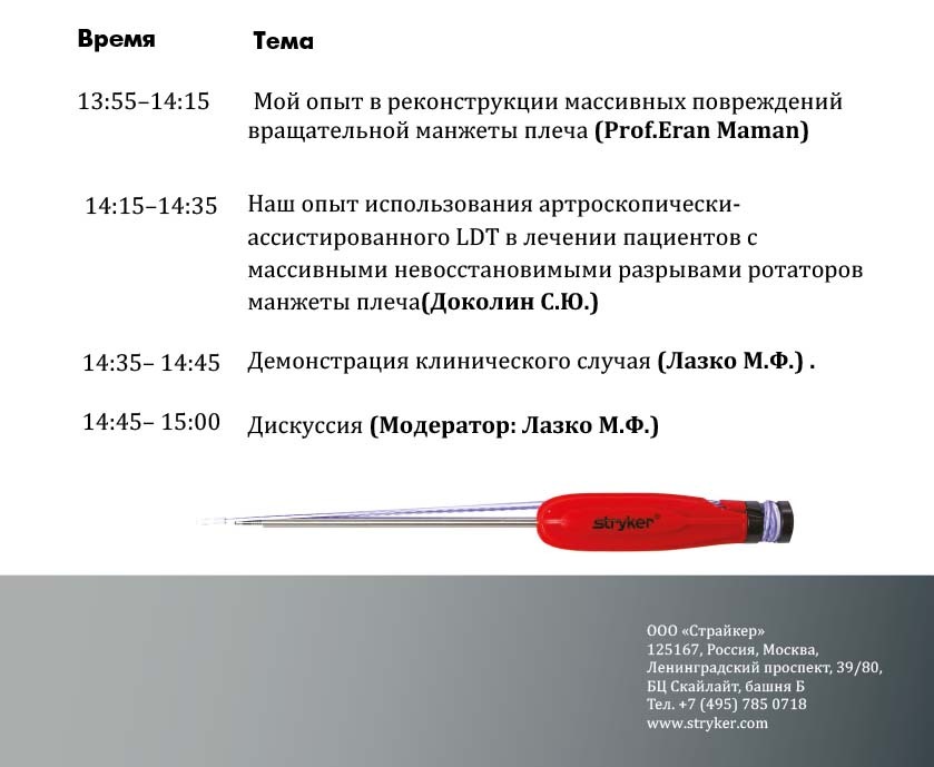 13:35 «Осложнения после артроскопических операций на вращательной манжете. Причины неприращения сухожилий и инновационные методы их решения». Строганов Василий Александрович (Заведующий отделением травматологии и ортопедии ЧУЗ ЦКБ РЖД медицина. Москва). При поддержке ООО «Джонсон & Джонсон», баллы НМО не начисляются